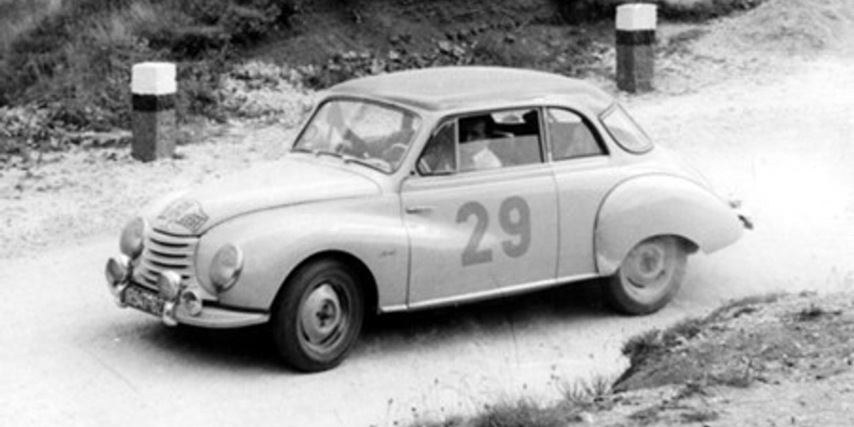 When the DKW 3 = 6 Sonderklasse with three-cylinder engine appeared in 1953, it was seized upon immediately by keen motor sport drivers as a promising competition car. In the autumn of that year a new motor sport department was opened in Düsseldorf with the experienced competition driver Karl-Friedrich Trübsbach as its head. The target for 1954 was ambitious: to enter for European Rally Championship events. With drivers Walter Schlüter, Gustav Menz and Heinz Meier, an almost unbelievable success was achieved. In its first season DKW took the first three places in the European Rally Championship rankings, and Heinz Meier also won the German Rally Championship title.